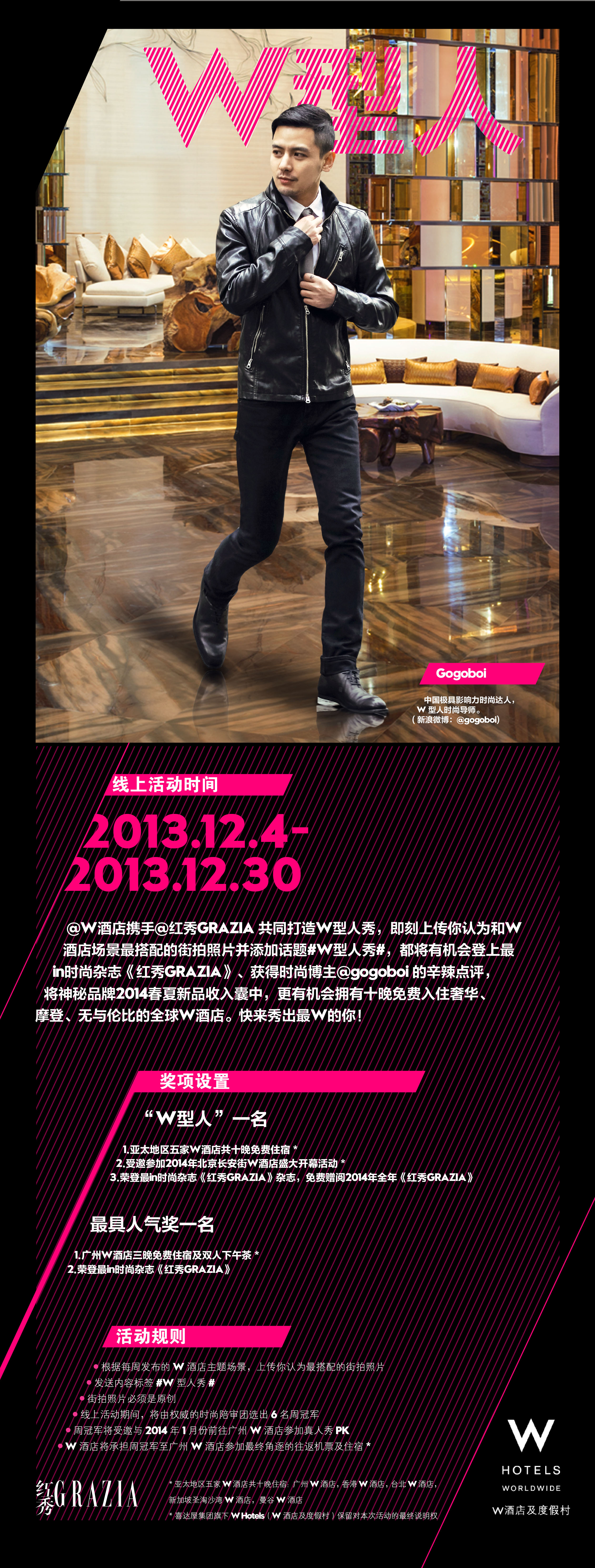 了解更多有關(guān)W型人秀活動(dòng)信息,馬上去微博關(guān)注@W酒店 和@紅秀GRAZIA 吧!