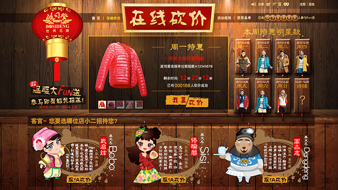 本次活動(dòng)采用全新的“在線砍價(jià)”互動(dòng)模式,詼諧幽默的店小二更是見招拆招迎戰(zhàn)參與挑戰(zhàn)的砍價(jià)高手,性格迥異的店小二哪個(gè)才是你的菜呢?不妨試試看,你的價(jià)格你做主,買到羽絨服才靠譜!情商極高的店小二還會(huì)對(duì)你的砍價(jià)招數(shù)做出搞笑評(píng)價(jià),將其分享還能參加驚喜環(huán)節(jié),大獎(jiǎng)逐級(jí)遞增。2013年12月16日,波司登“溫暖大Fun送”,開門迎來八方客,“砍價(jià)神人”在民間。