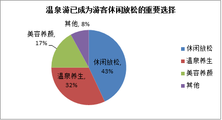 溫泉游已迎來了發展的黃金期,據驢媽媽相關調查顯示,超過43%的游客將溫泉游作為休閑放松的首選目標、32%的游客青睞于溫泉養生、17%的游客選擇美容養顏、8%的游客選擇其他。由此可見,休閑放松已成為游客選擇溫泉游的重要目的。